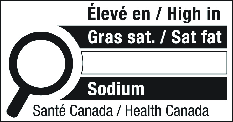 Nouvellement arrivée sur nos emballages, la loupe nutritionnelle sert à identifier les aliments qui contiennent 15 % ou plus d’apport quotidien en gras saturés, en sucres (ajoutés ou libres) et en sodium.
