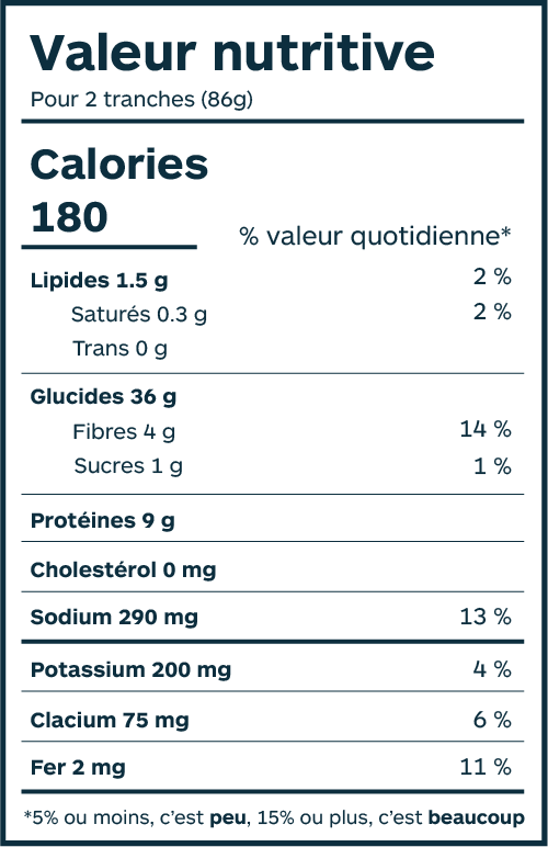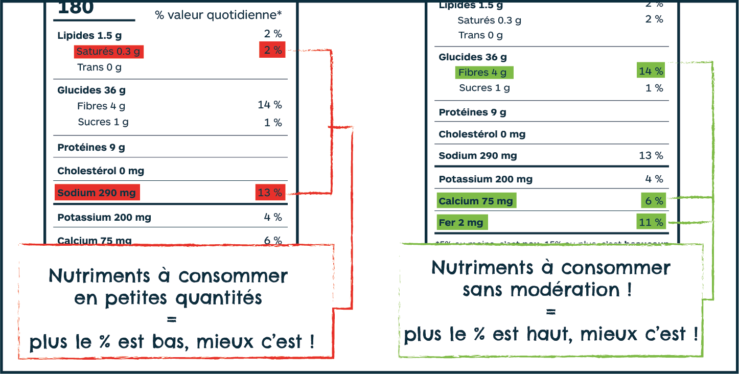 Le tableau de valeur nutritive indique un pourcentage de valeur quotidienne à côté des nutriments, à l’exception des glucides et des protéines. Pour les nutriments qu’on cherche à consommer en moins grande quantité, comme les gras trans ou le sodium, on cherche à avoir le plus petit pourcentage possible. La valeur recommandée pour ces nutriments est une quantité maximum à ne pas dépasser pour ne pas augmenter les effets néfastes sur la santé. Pour les nutriments qu’on cherche à manger en plus grande quantité, comme les fibres et le calcium, on veut le plus grand pourcentage possible. La valeur quotidienne représente une valeur minimale pour pleinement profiter des bienfaits de ce nutriment. Il n’y a pas de pourcentage de valeur quotidienne pour les glucides et les protéines, car la quantité à consommer par jour varie beaucoup d’une personne à l’autre.