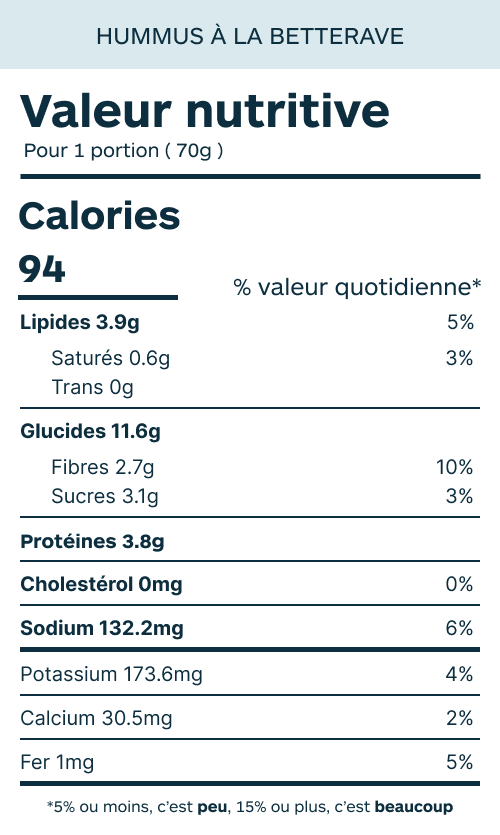 On vous propose ici un hummus un peu spécial : en plus d’être d’une couleur pour le moins flamboyante, il est fait à partir d’haricots rouge plutôt que de pois chiche. La combinaison de betterave, de vinaigre balsamique, de citron et de cumin donne un hummus hors du commun, acidulé et un peu sucré. Il peut être mangé en trempette, mais accompagne aussi très bien la viande et fait une sauce super pour nos wraps à base de tortillas magiques.